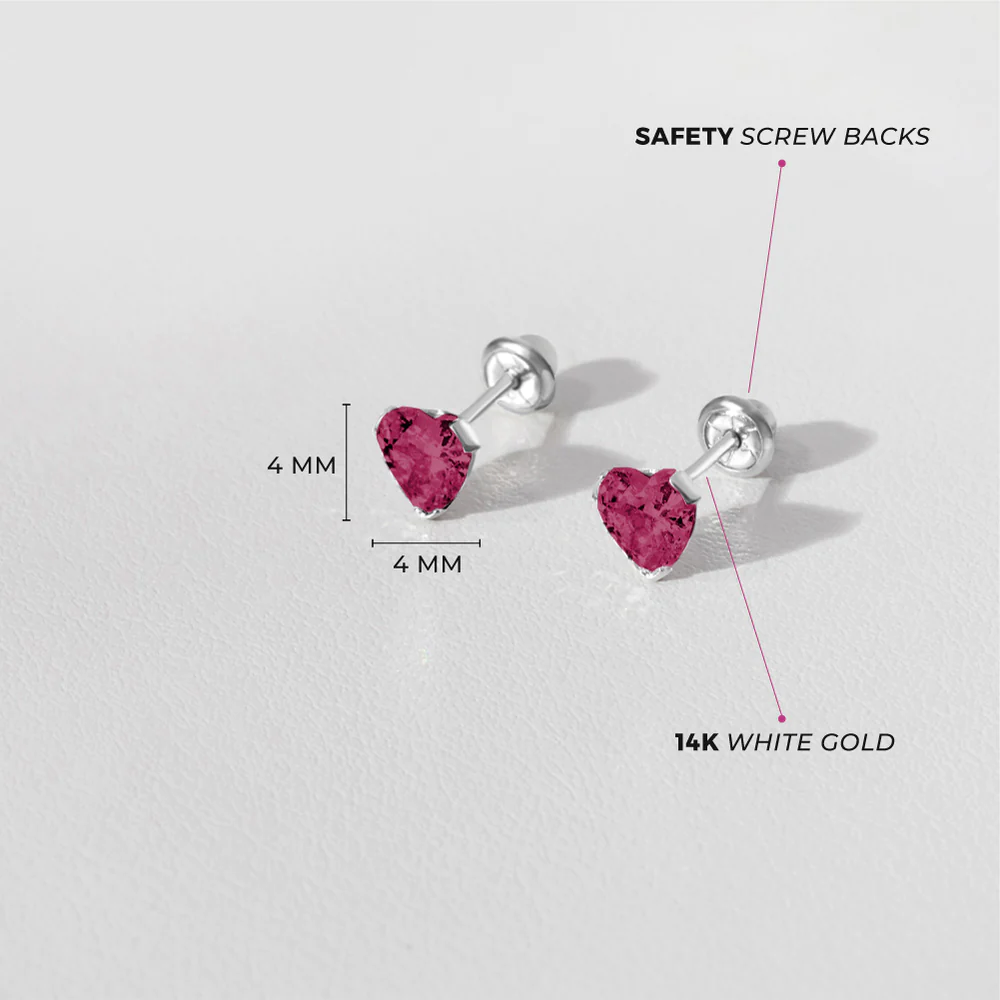 Birthstone White Gold Heart Kids Earrings - July